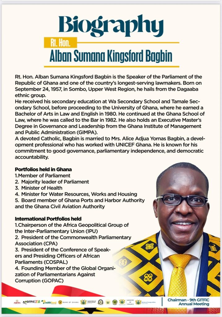 The Ghana International Trade and Finance Conference (GITFiC), working in collaboration with the National Technical Working Committee of the GITFiC Agenda 2031, is proud to announce that the Right Honourable Speaker of Parliament of Ghana, Alban Sumana Kingsford Bagbin, will serve as Chair of the 9th edition of the Ghana International Trade and Finance Conference (GITFiC 2025).