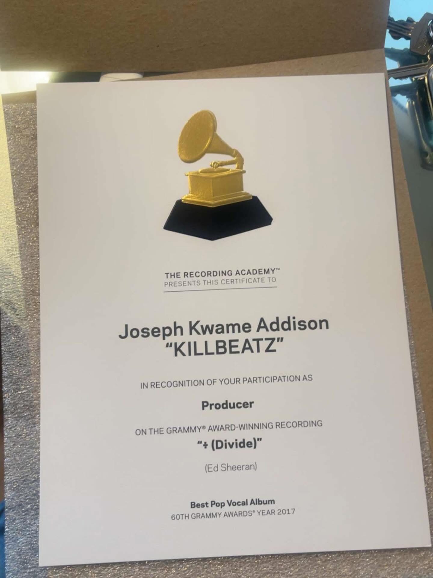 A certificate presented by The Recording Academy honors Killbeatz for his role as a producer on Ed Sheeran’s critically acclaimed album “(Divide),” which won Best Pop Vocal Album at the 60th Grammy Awards in 2017. This recognition places the Ghanaian hitmaker among an elite group of creatives whose work has contributed to one of the most celebrated projects in modern pop music.